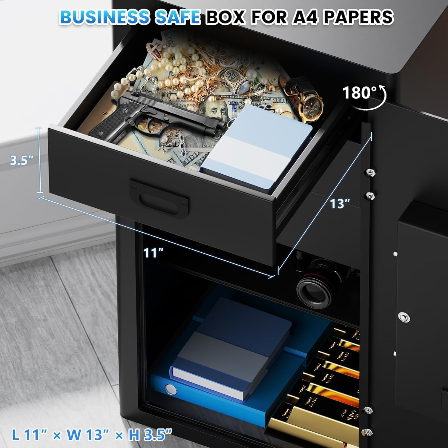 【2025 NEW OVERSIZED DOCUMENT SAFE BOX WITH REMOVABLE SHELF】: Inside measurement: 27″H x 14″W x 15″D. Nice for storing A4 parpers, handguns, 1000’s of ammo and valuables. The detachable shelf can meet the wants of the entire household. The additional-large inside area permits you to maintain nearly any valuables, together with laptops, pistols, jewellery, paperwork, money, and extra. BEST CHOICE FOR YOU TO PROTECT YOUR VALUABLES FROM THEFT.