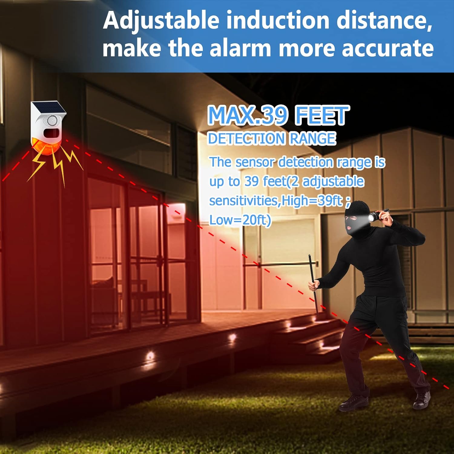 Adjustable Sensitivity Movement Alarm:This outside movement sensor alarm provides adjustable sensitivity settings for efficient drive out animals and scale back the false alarms.The outside siren has two ranges sensitivity,excessive degree is 29-39ft(9-12m),low degree is 16-26ft(5-8m).Settings might be personalized primarily based on private preferences, making certain environment friendly animals administration
