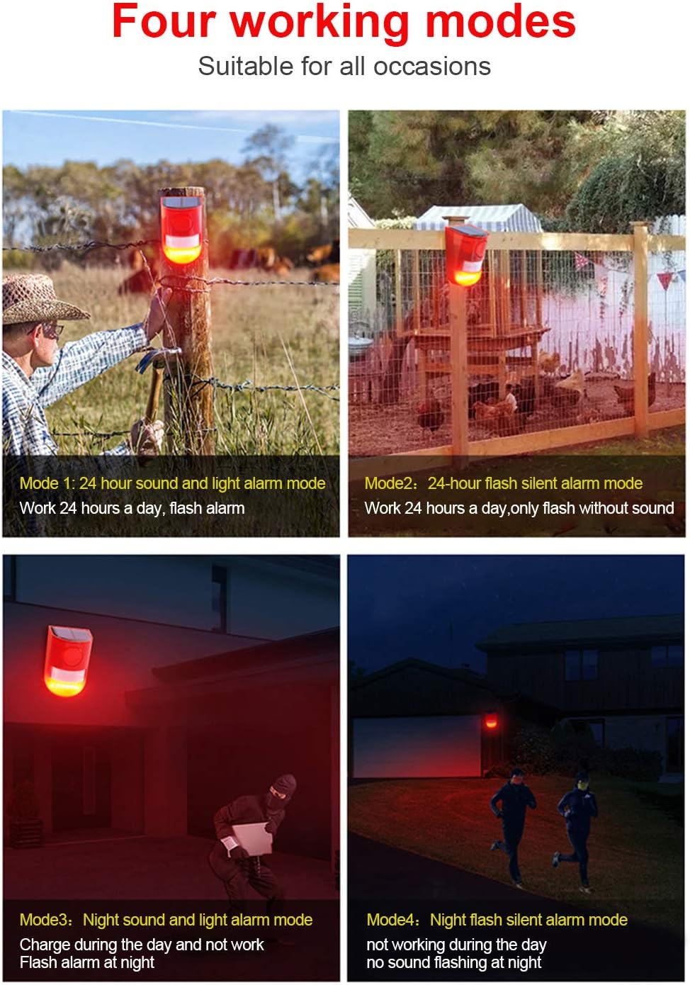 🚨 【4 Modes Perform You Can Select】 ①24 hours with flash and alarm ②24 hours with flash however with out alarm ③at the night time with flash and alarm ④at the night time with flash solely.