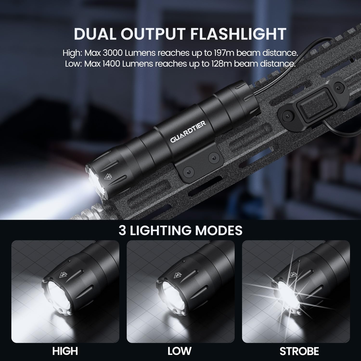 Highly effective Illumination: With a formidable excessive mode of 3000 Lumens and a helpful low mode of 1400 Lumens, the Guardtier M105 ensures clear visibility in any scenario. In excessive mode, it reaches as much as 197m, whereas in low mode, it covers a major distance of 128m, offering a flexible lighting resolution for varied eventualities.