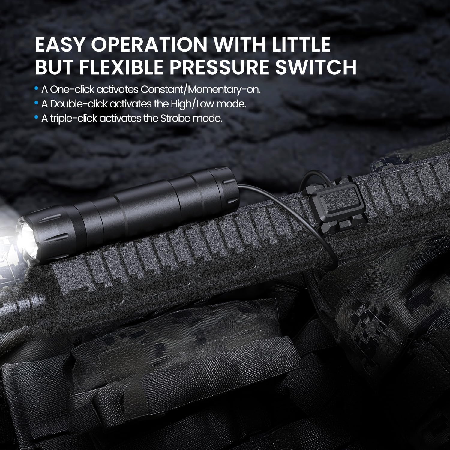 Versatile Operation: Geared up with a stress swap, it allows one-handed operation with ease. You simply want to softly press it to shortly flip the flashlight on or off, facilitating you to regulate the lighting promptly whereas holding the rifle and guaranteeing the excessive effectivity and continuity of your actions. A triple-click prompts the STROBE mode, which will be essential in emergency conditions or for signaling functions.