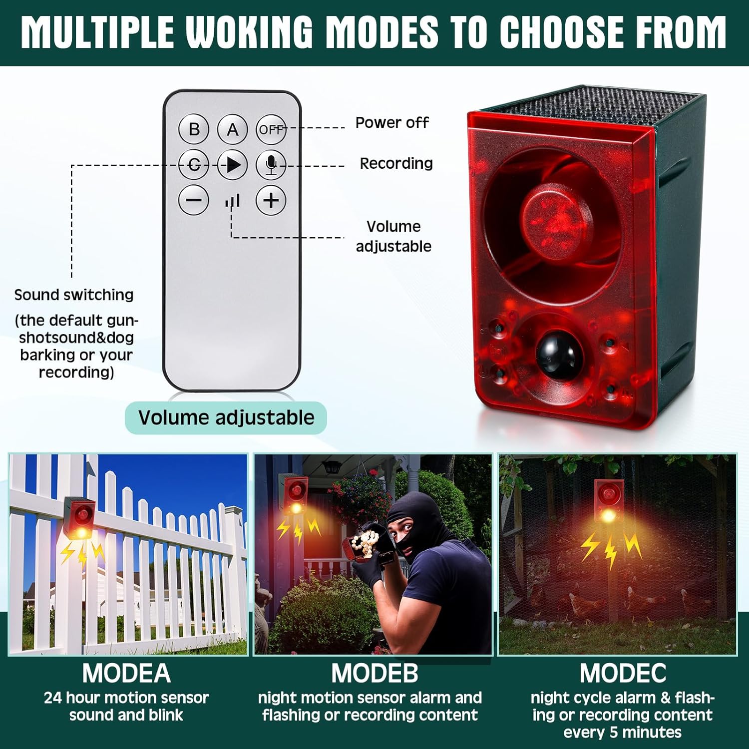A number of Modes to Select from: the bottom plug photo voltaic outside movement sensor alarm: distant management A mode 24H sensing sound and light-weight, B mode night time sensing sound and light-weight, C mode change sound, D mode host standby; The speaker movement alarm outside: a mode 24H movement sensor alarm and flashing or recording content material, B mode night time movement sensor alarm and flashing or recording content material, C mode night time cycle alarm and flashing or recording content material each 5 minutes