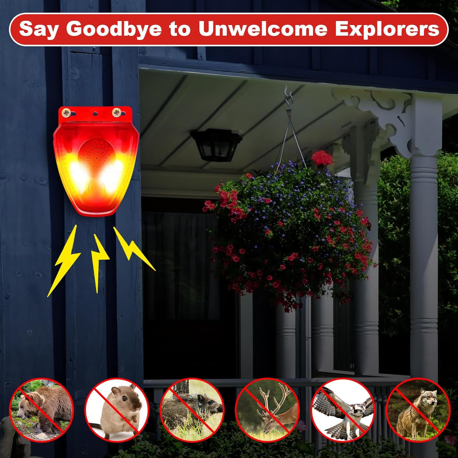 Formidable 129dB Alarm with 10 Scare Sounds: geared up with a robust 129dB alarm, this system employs quite a lot of randomized sounds together with gunshot, canine bark, wolf, tiger, firecracker, police siren, eagle screech, and extra, can successfully repel wild animals, safeguarding your property in opposition to deer, boars, and extra with ease and effectivity