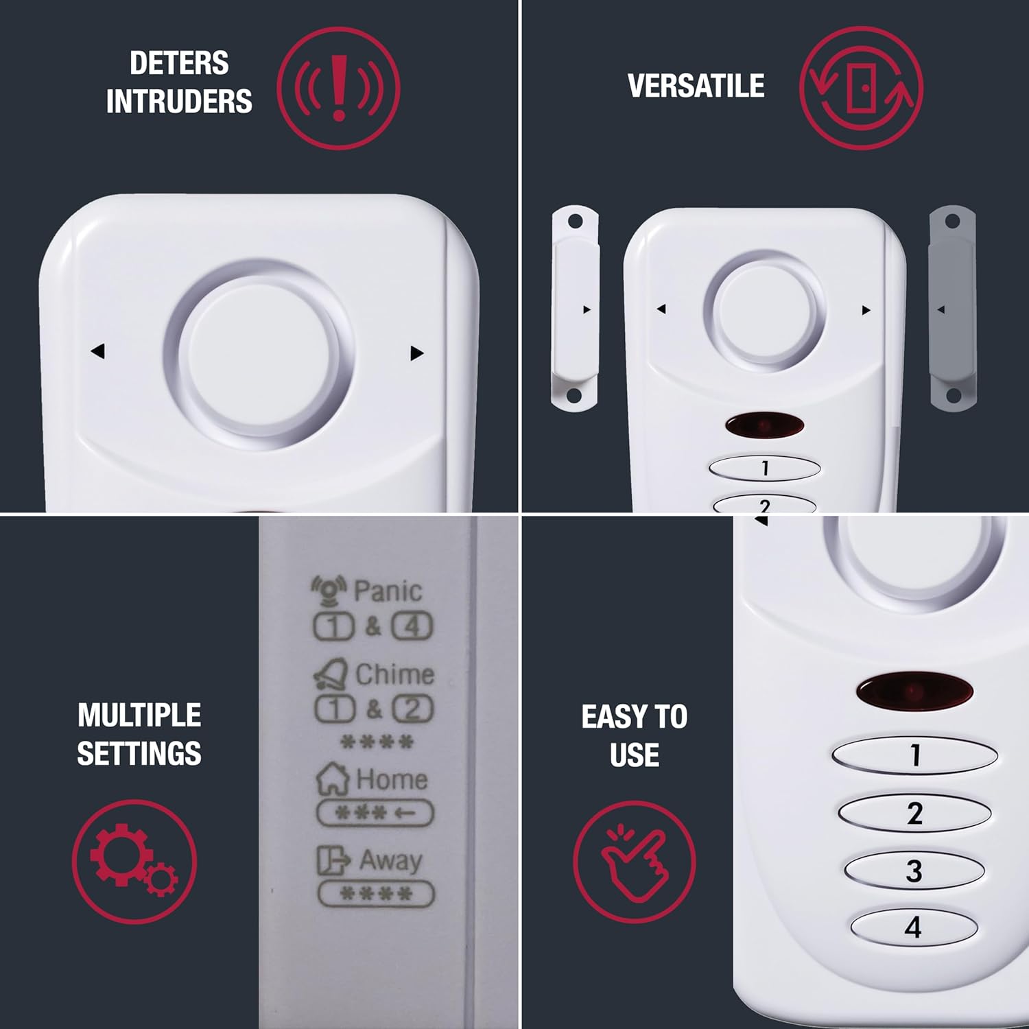 EASY INSTALLATION: 4 adjustable settings (chime/house/away/panic); chime mode is good to alert when friends are coming & going whereas at house; Panic mode sounds alarm with key mixture; Wi-fi alarm works on each left & proper facet opening doorways