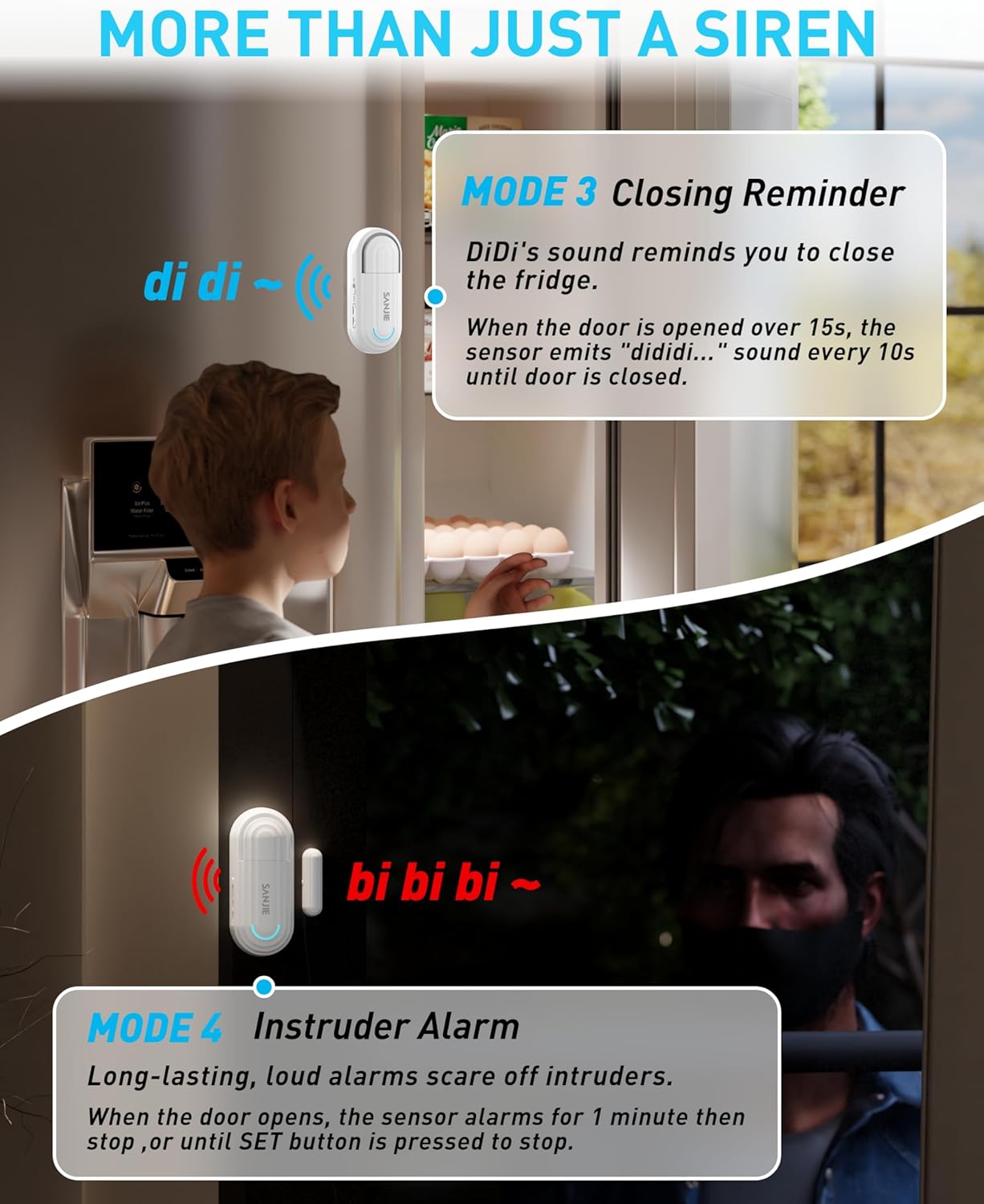 The 4 modes of the door/window opening alarm sensor and the amount adjustment(0-120dB) meet the wants of various situations.