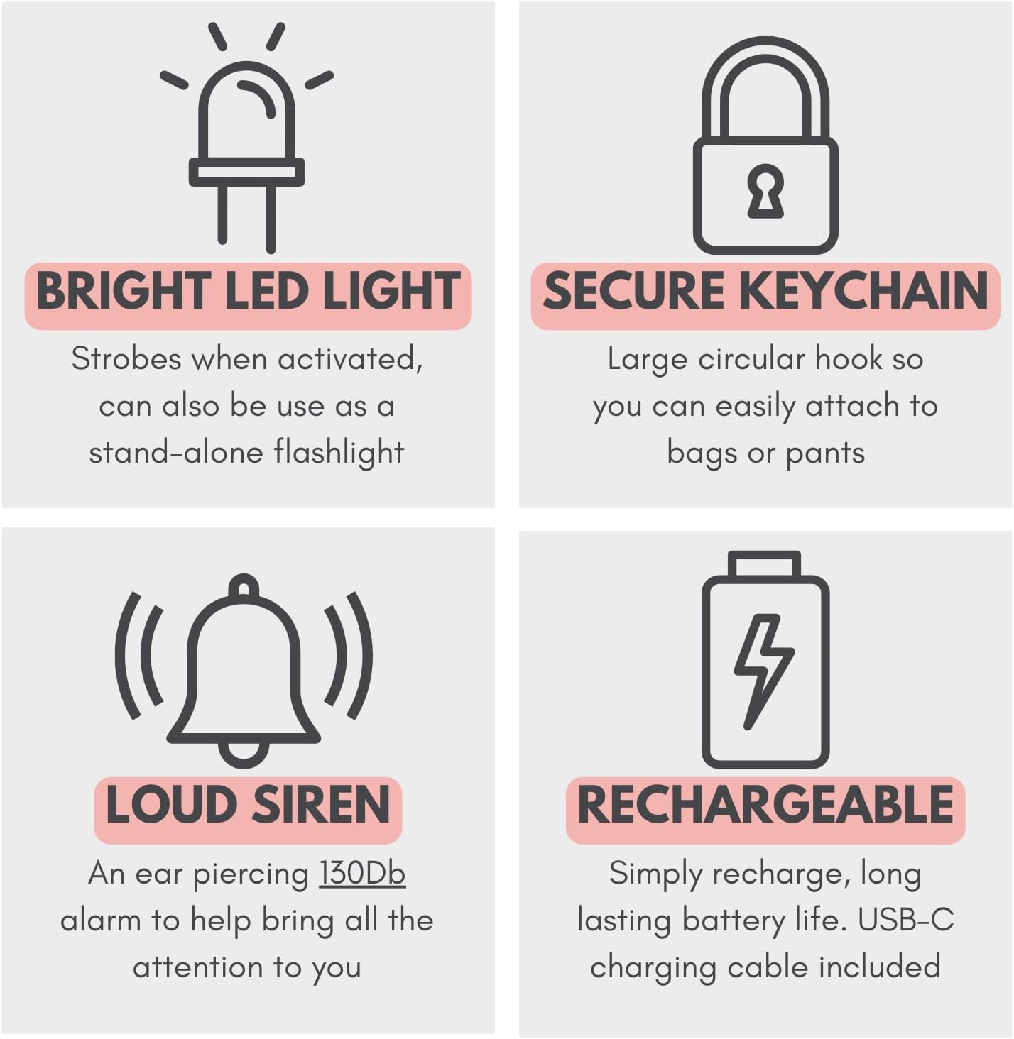 Deliver ALL the Consideration to You: When the private alarm keychain for ladies is activated, the ear-piercing 130dB siren and vibrant strobing SOS mild will alert others and deter potential threats.