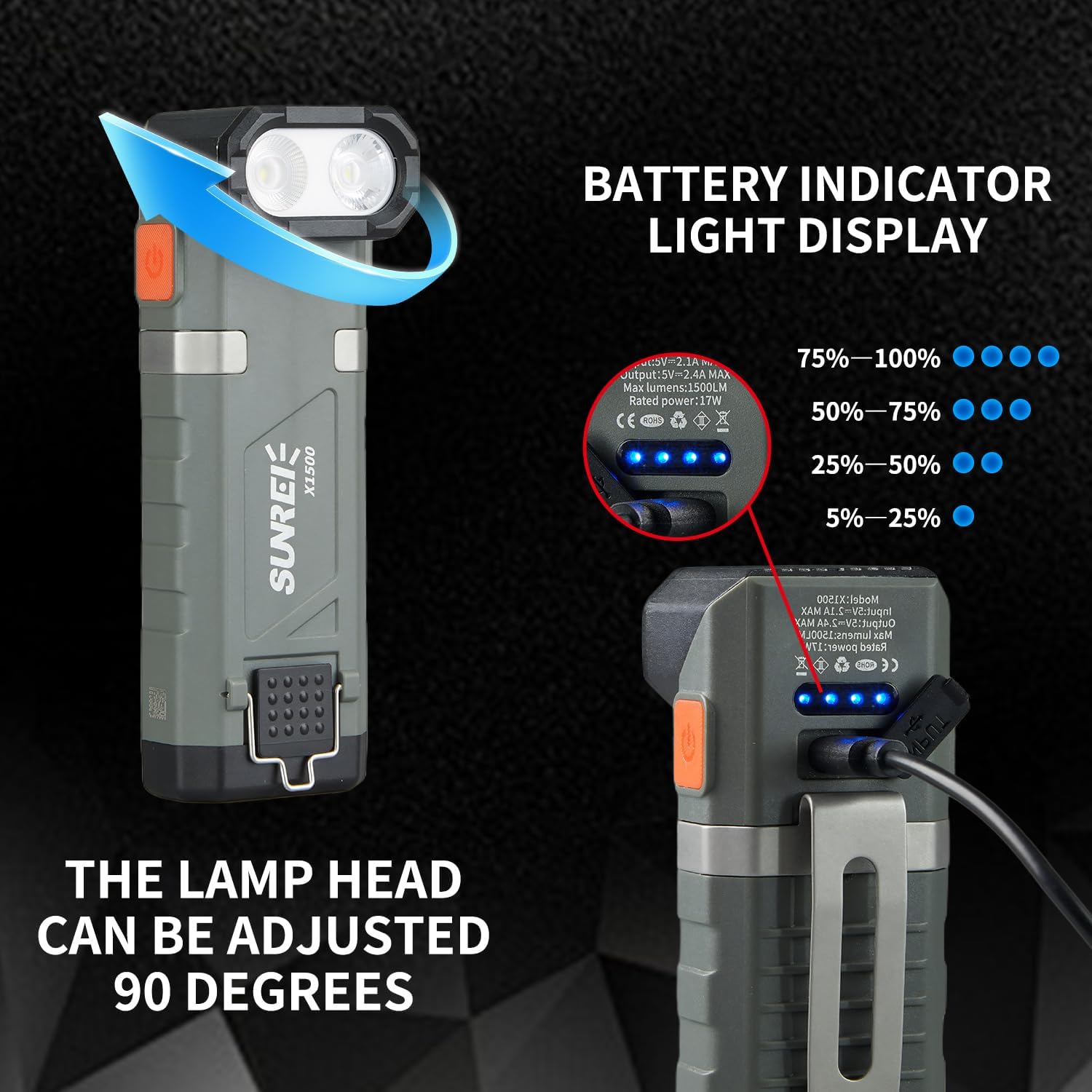- 20% SUNREI 1500LM Tremendous Shiny EDC Flat Flashlight, 90° Adjustable Head Rechargeable Tactical Flashlight with Magnetic Base, Steel Clip & Hook, 6 Brightness Ranges for Emergency, Out of doors Actions