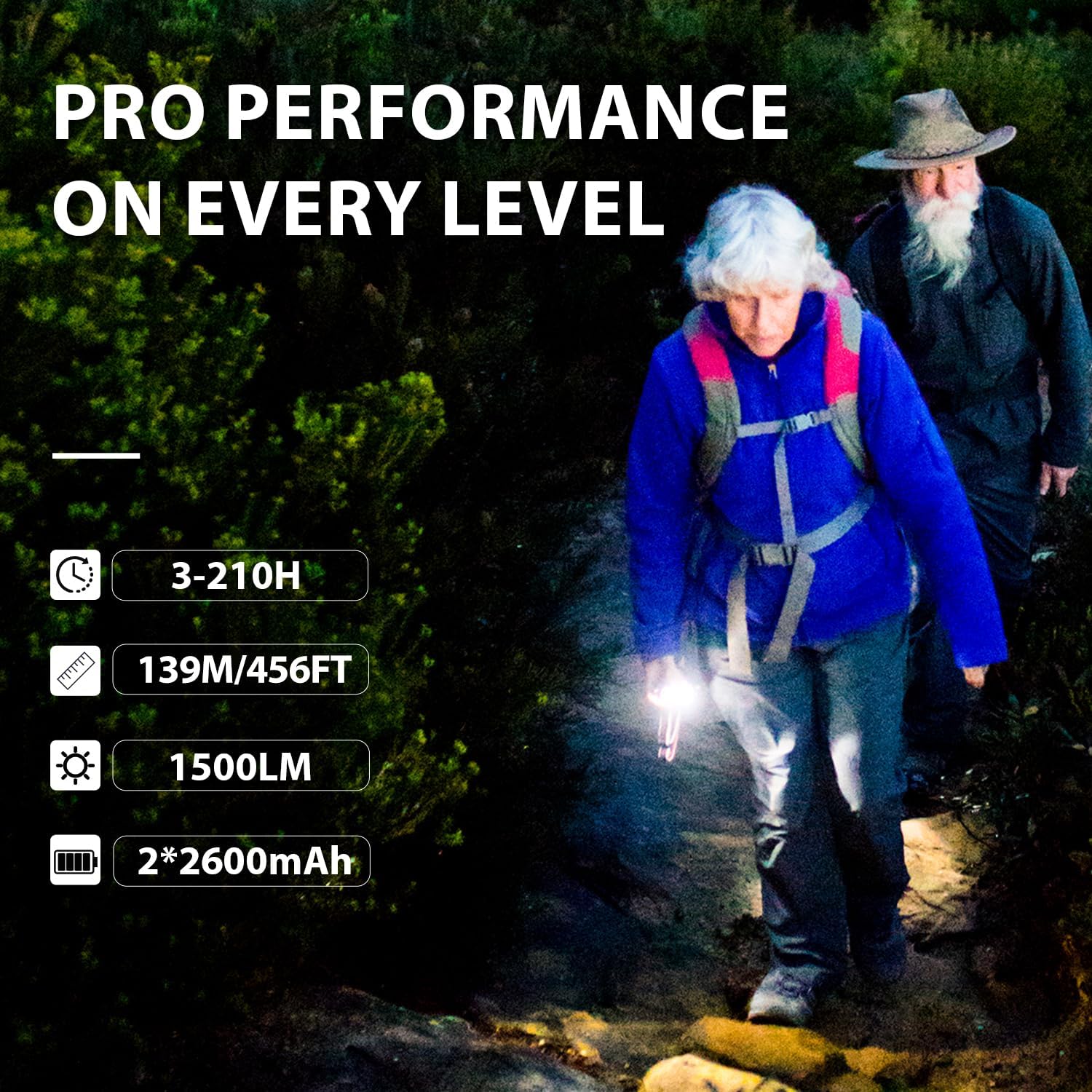 Weight 0.5lb Energy 20w Battery capability 2600mAh*2 Waterproof grade IPX5 Lengthy vary 456ft Lumen 1500 lumen Battery life 210H Shade temperature 6000K