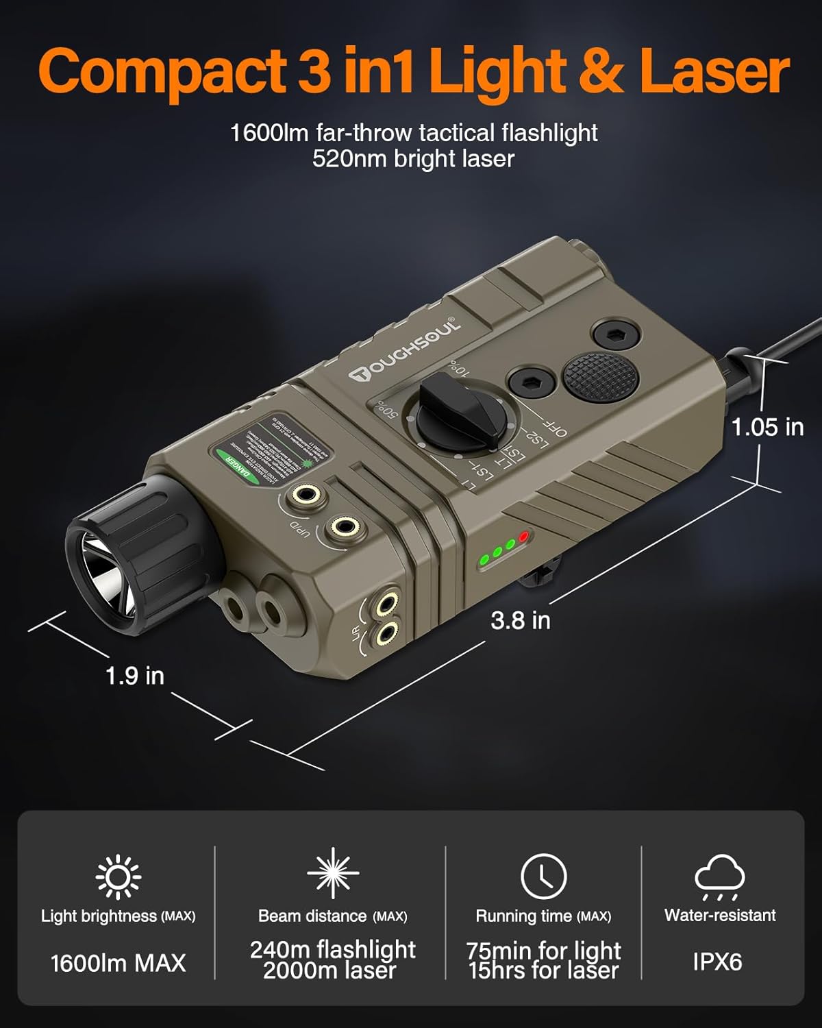 3 in 1 Laser mild combo: 1600lm white led with Pink Laser 650nm, inexperienced laser 530nm, Class IIIA <5mw Secure Laser Output