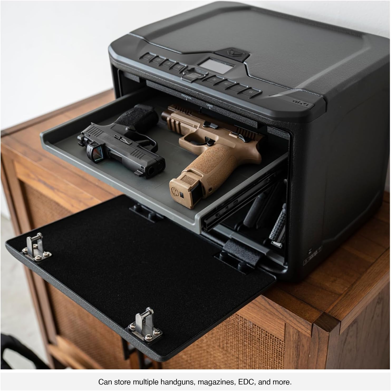 Excessive Capability Inside can retailer as much as (8) handguns, magazines, passports, money, pockets, EDC, and mountable to nightstands or different stationary objects utilizing the pre-drilled holes and included mounting {hardware}. Shops nice in a closet, bed room, or workplace.
